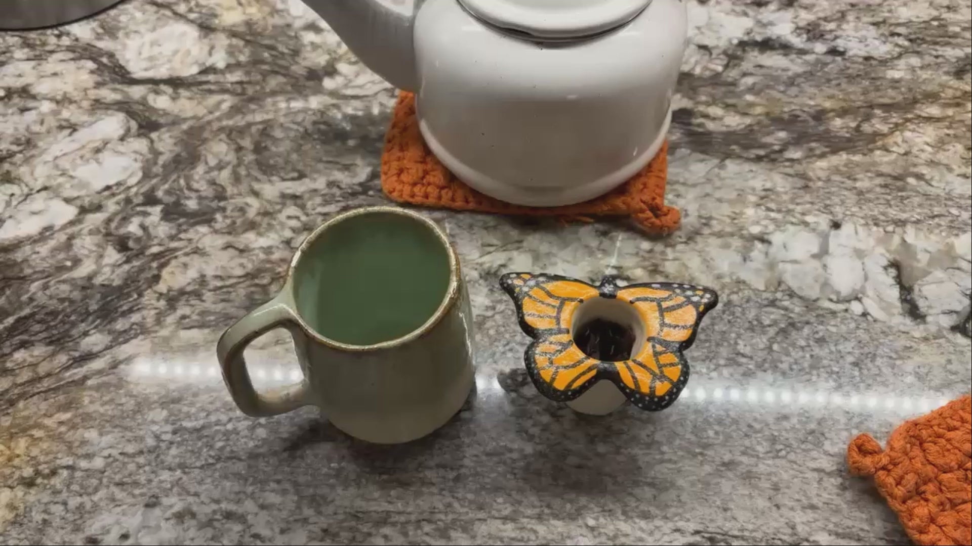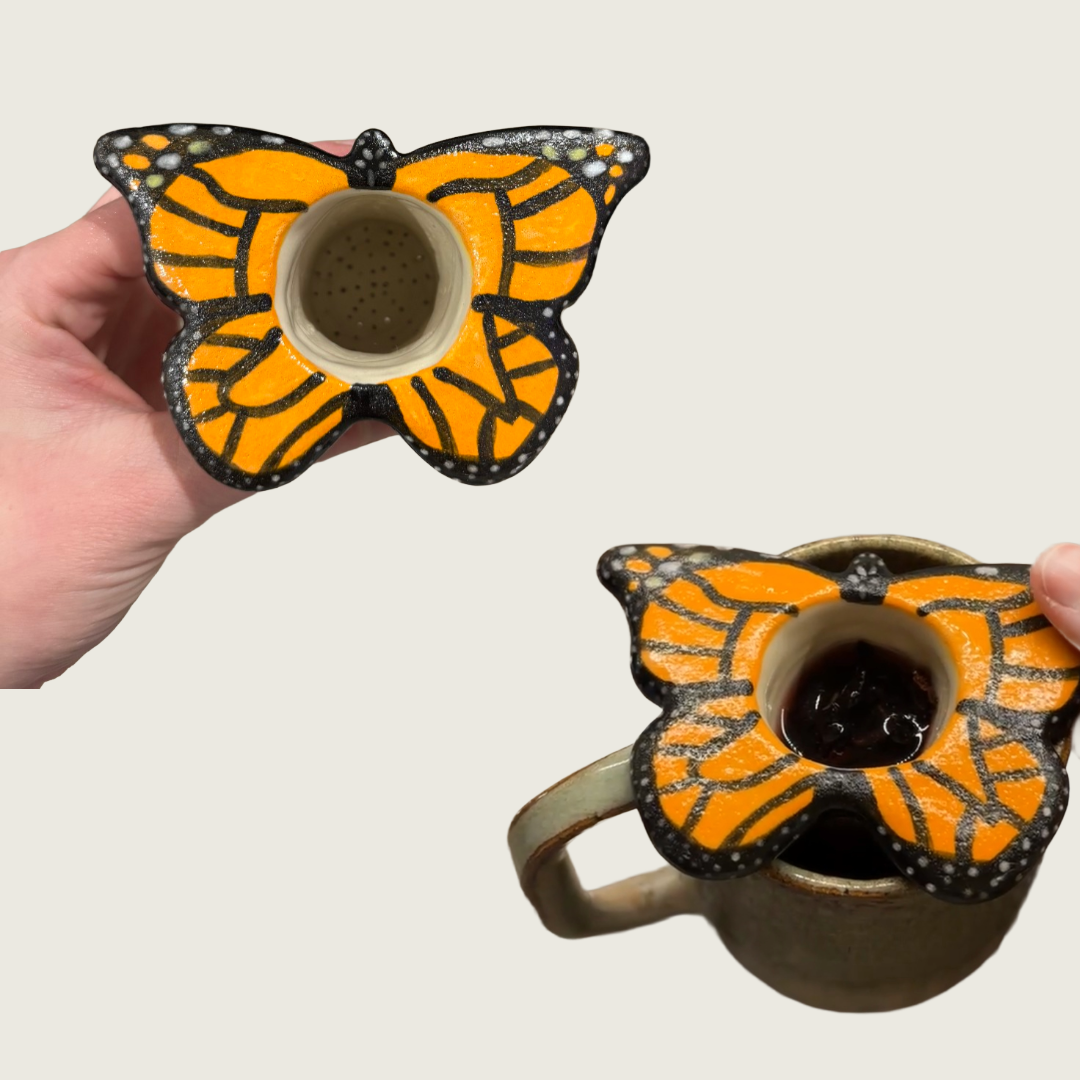 These gorgeous monarch butterfly tea steepers were created in collaboration with BA Ceramics -a local ceramic artist out of Cleveland, Ohio - for Pollinator month 2025. Each piece is hand-painted, and is food safe, microwave and dishwasher safe. We specifically designed the holes of the steeper to be as small as possible so no sediment gets in your cup, but still allows you maximum flavor infusion. Let tea time be a beautiful experience and make a statement that pollinators matter! As always, 5% is donated to the Monarch Joint Venture and native milkweed seed to your region is included in your order.